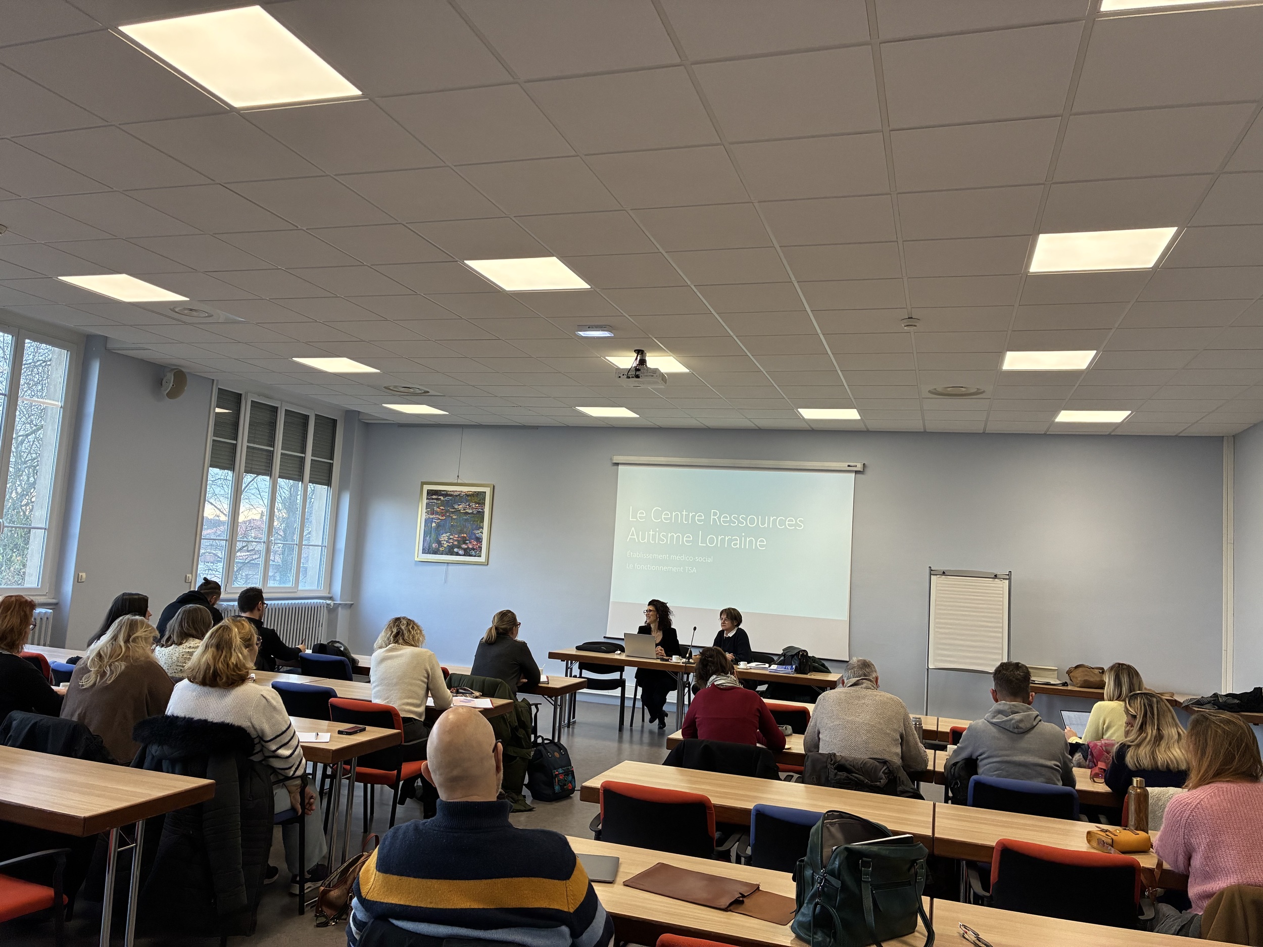 Le mercredi 26 novembre s’est tenu un regroupement des enseignants spécialisés des départements 54 et 55. Cette journée de travail a été marquée par l’intervention de deux cheffes de service du Centre Ressources Autisme (CRA) de Laxou : Mmes Emmeline DOR et Laurence DUCHAMP PIERREFEU.